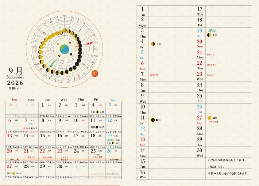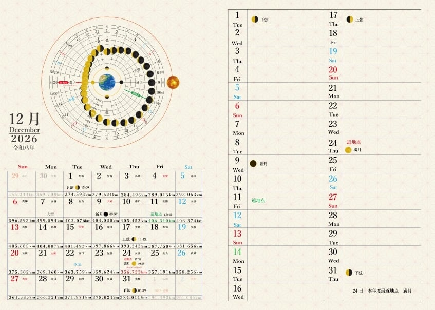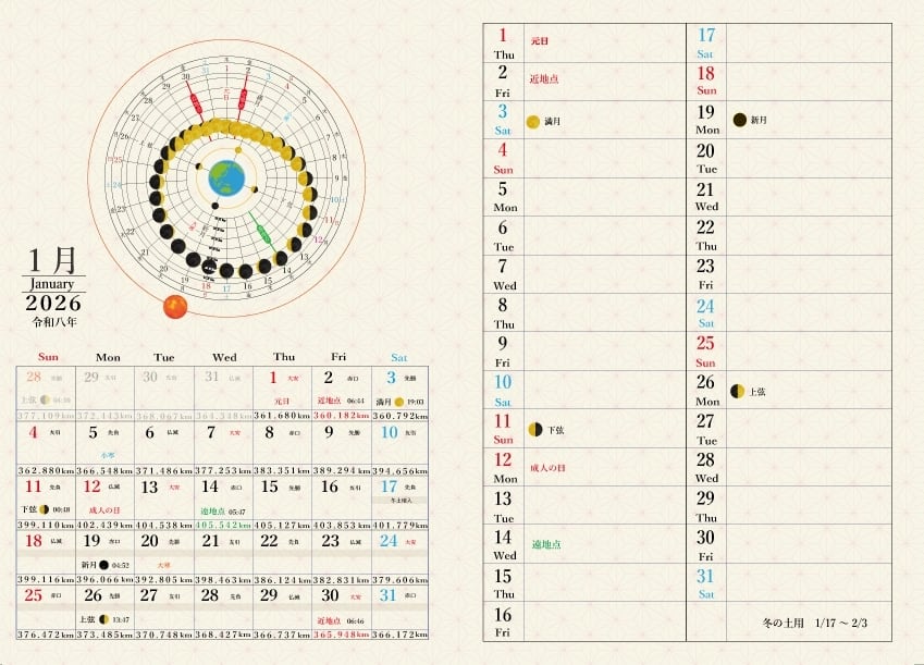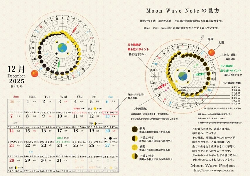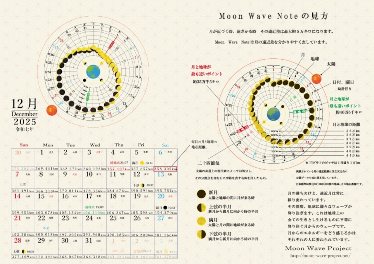 Moon Wave Note2026年版月の遠近の距離を掲載した手帳(A5サイズ)です。